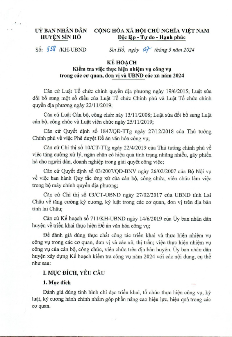| Tiêu đề văn bản | Kế hoạch kiểm tra việc thực hiện nhiệm vụ công vụ trong các cơ quan, đơn vị và UBND các xã năm 2024 | ||