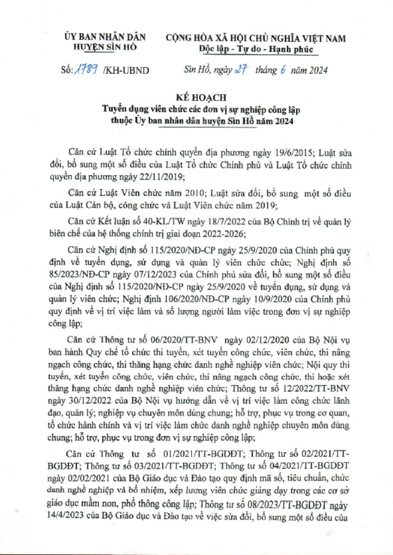| Tiêu đề văn bản | Kế hoạch Tuyển dụng viên chức các đơn vị sự nghiệp công lập thuộc UBND huyện Sìn Hồ năm 2024 | ||