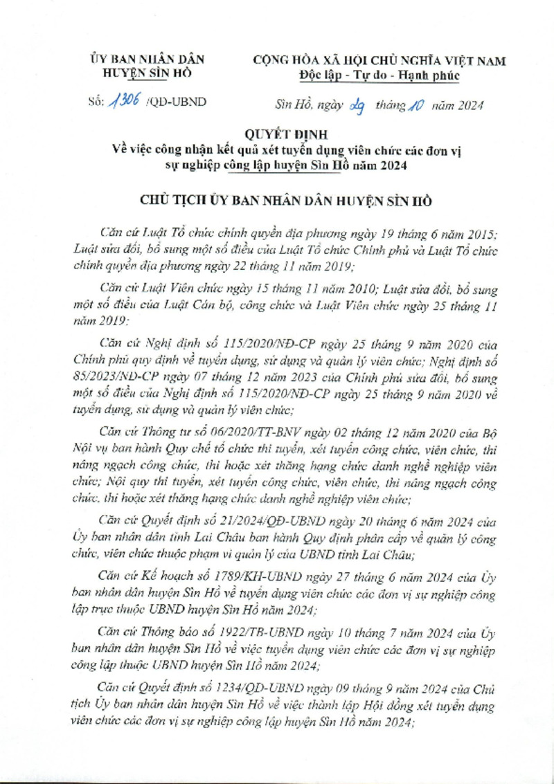 | Tiêu đề văn bản | Quyết định về việc công nhận kết quả xét tuyển dụng viên chức các đơn vị sự nghiệp công lập huyện Sìn Hồ năm 2024 | ||