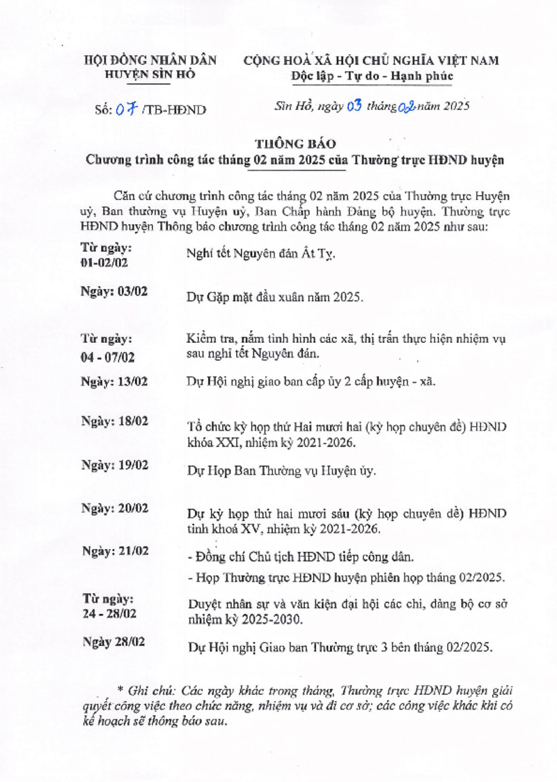 | Tiêu đề văn bản | Thông báo chương trình công tác tháng 02 năm 2025 của Thường trực HĐND huyện | ||