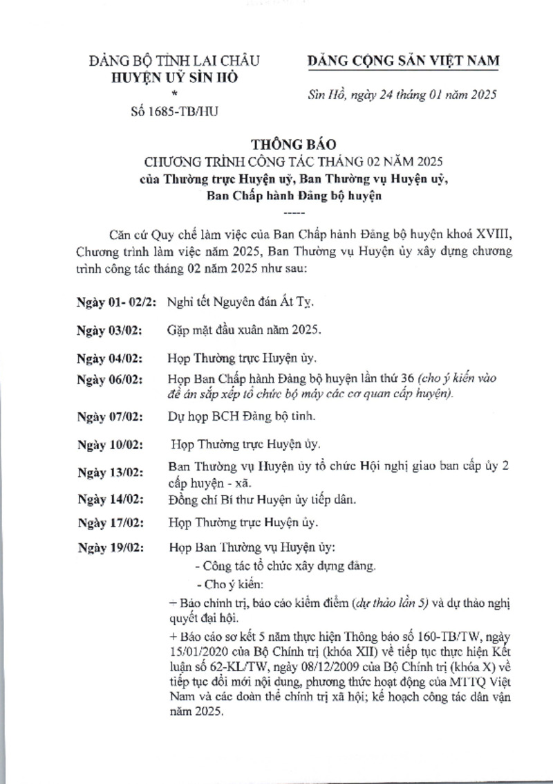 | Tiêu đề văn bản | Thông báo chương trình công tác tháng 02 năm 2025 của Thường trực Huyện ủy, Ban Thường vụ Huyện ủy, Ban Chấp hành đảng bộ huyện | ||