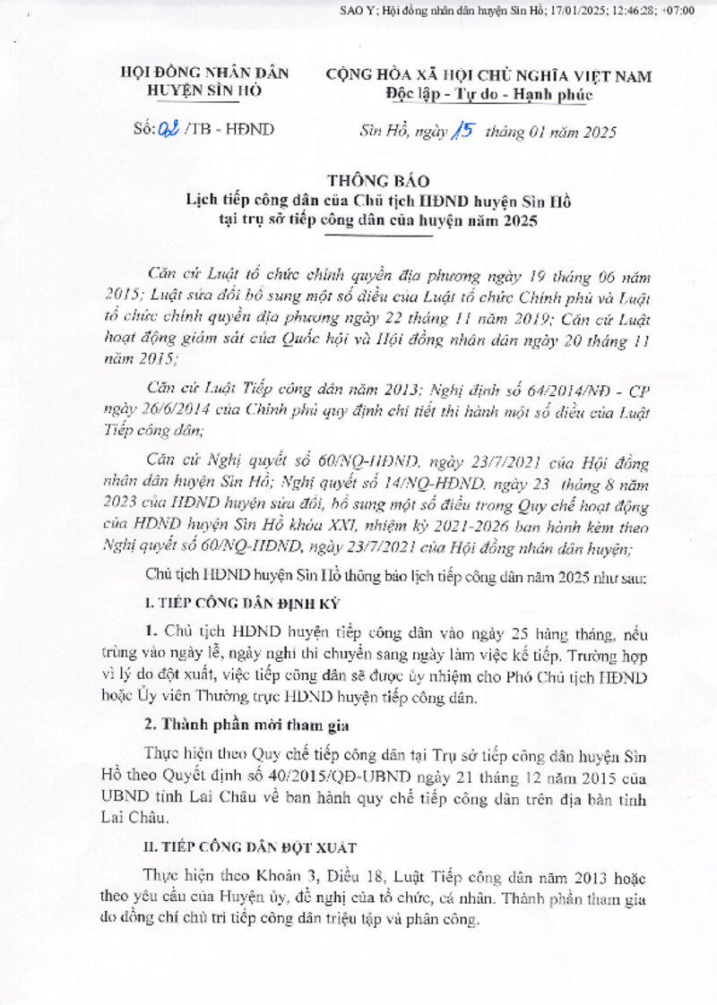 | Tiêu đề văn bản | Thông báo lịch tiếp công dân của Chủ tịch HĐND huyện năm 2025 | ||