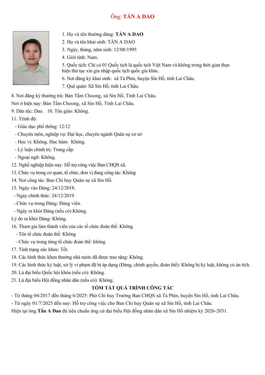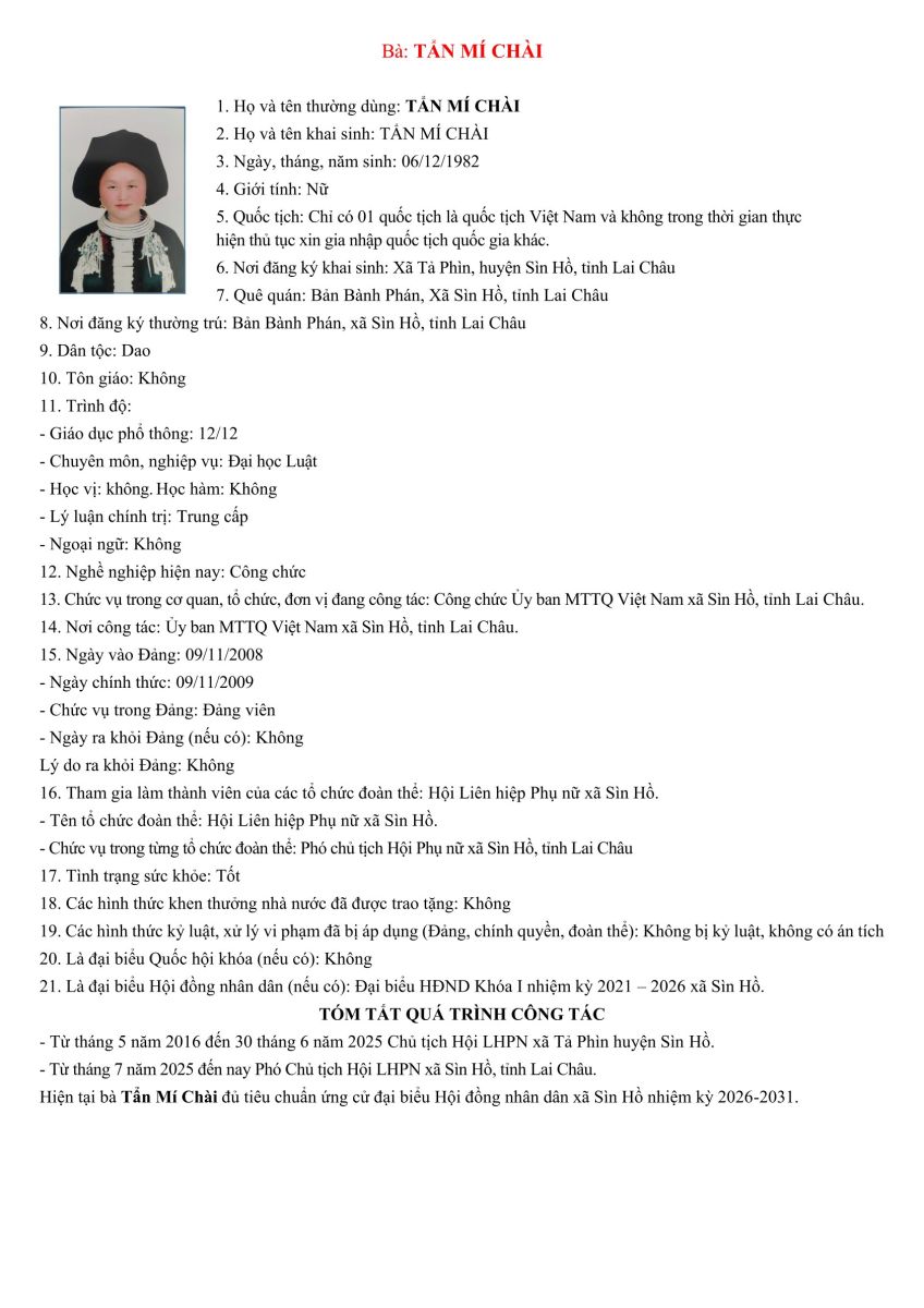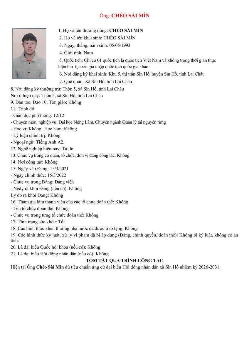 TIỂU SỬ TÓM TẮT NHỮNG NGƯỜI ỨNG CỬ ĐẠI BIỂU HỘI ĐỒNG NHÂN DÂN XÃ SÌN HỒ KHÓA II NHIỆM KỲ 2026-2031. ĐƠN VỊ BẦU CỬ SỐ 3