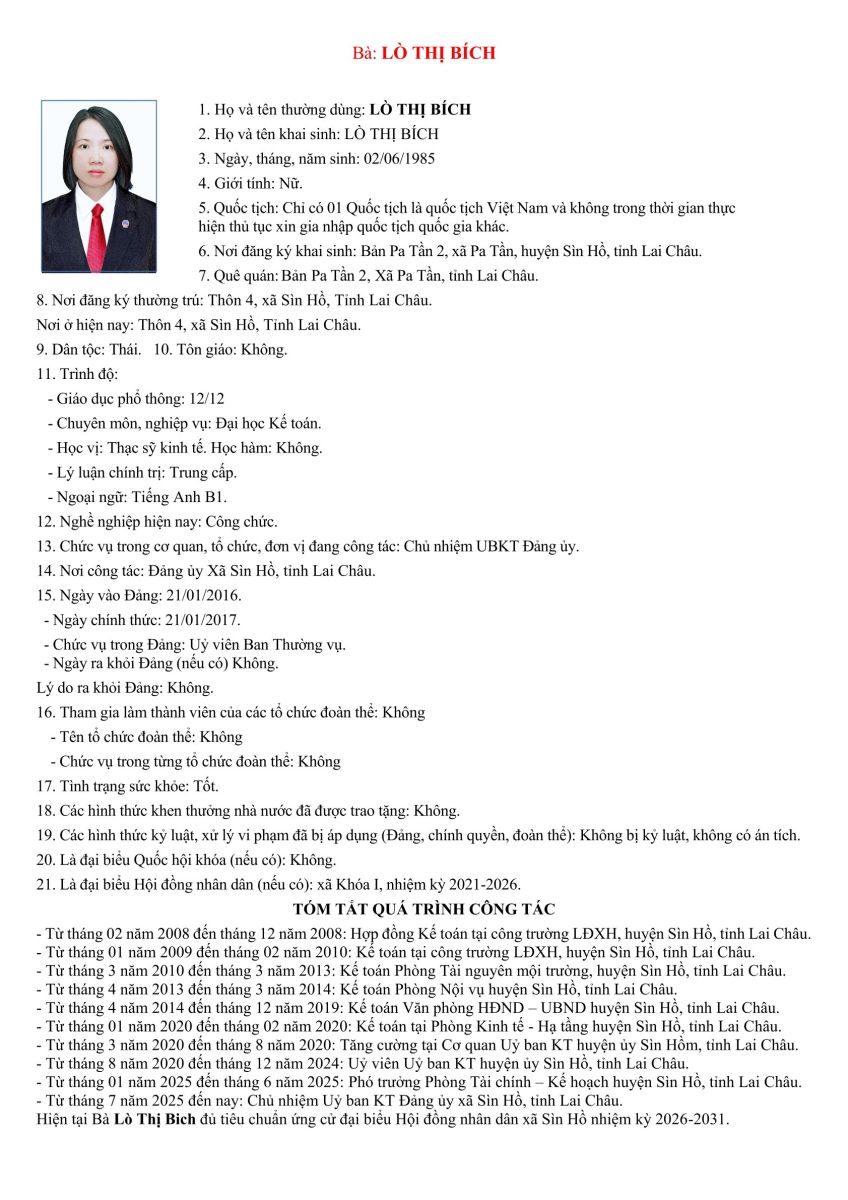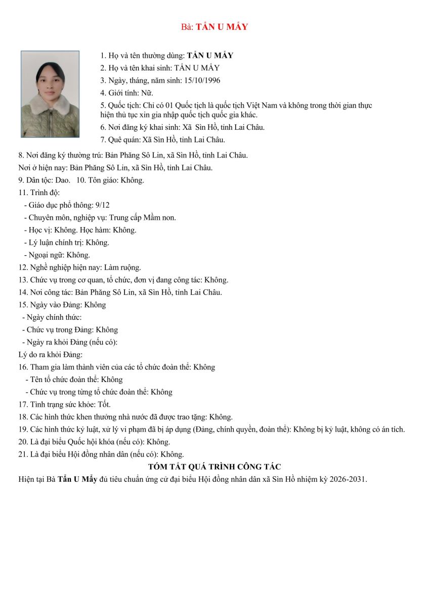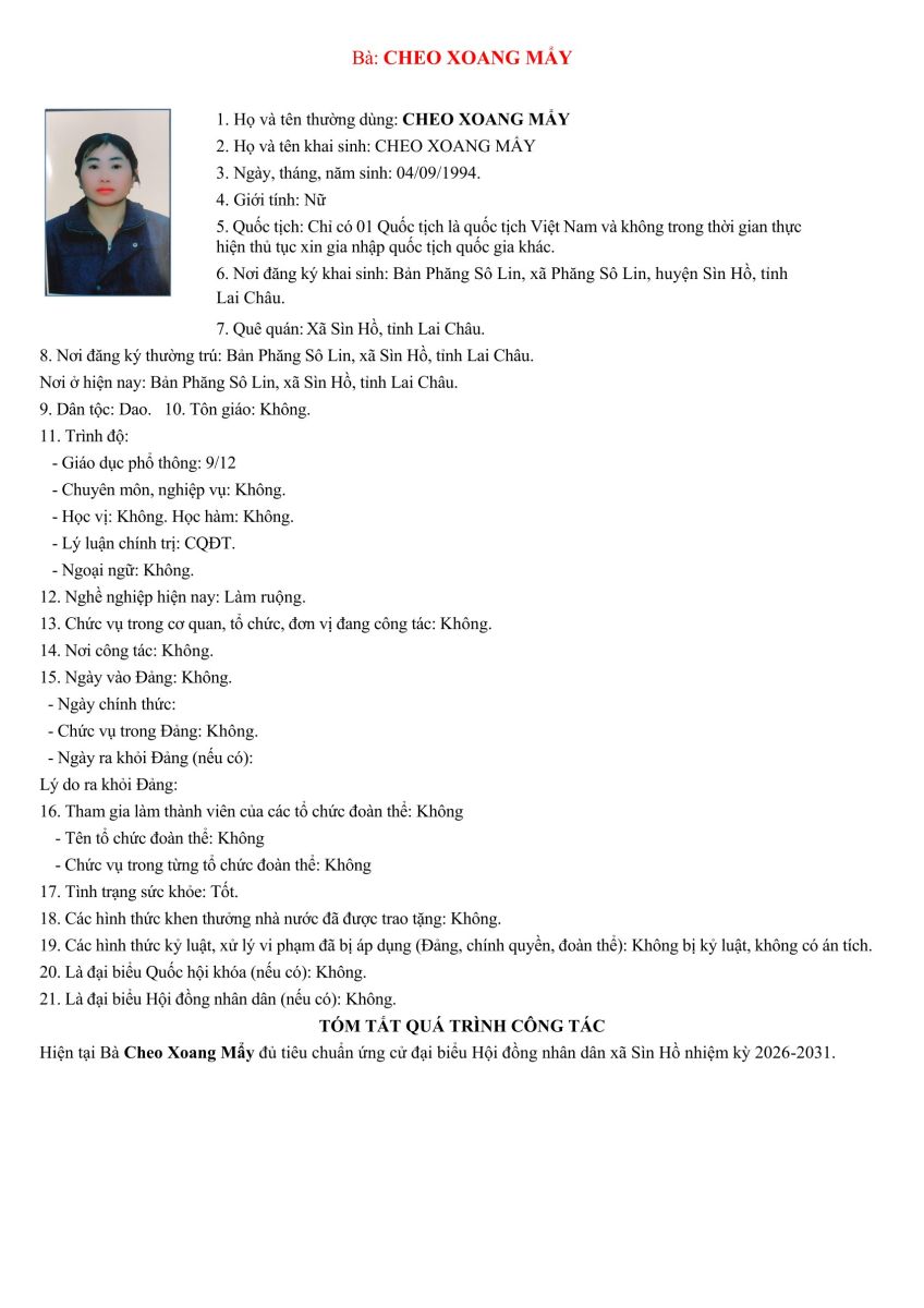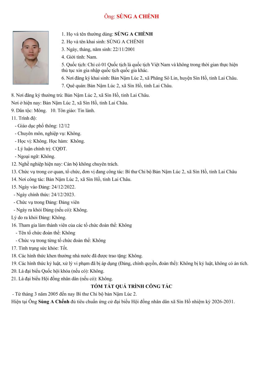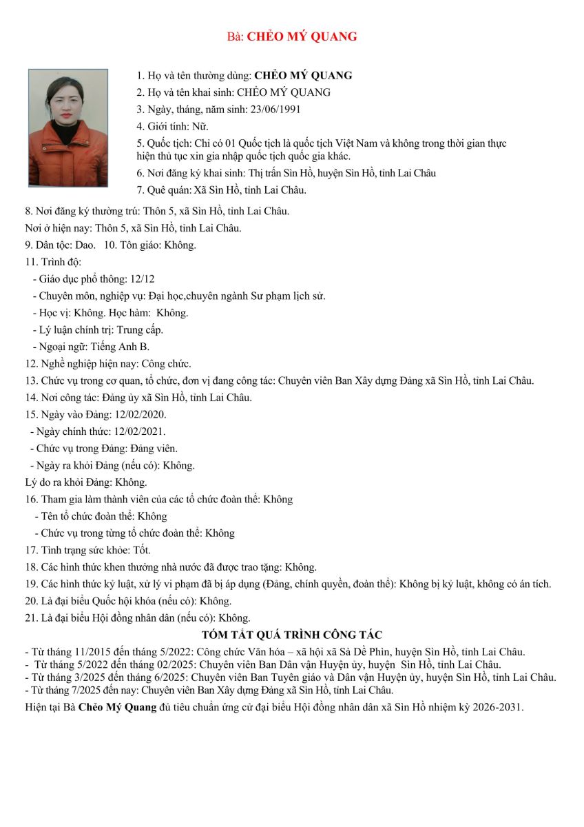 TIỂU SỬ TÓM TẮT NHỮNG NGƯỜI ỨNG CỬ ĐẠI BIỂU HỘI ĐỒNG NHÂN DÂN XÃ SÌN HỒ KHÓA II NHIỆM KỲ 2026-2031. ĐƠN VỊ BẦU CỬ SỐ 4