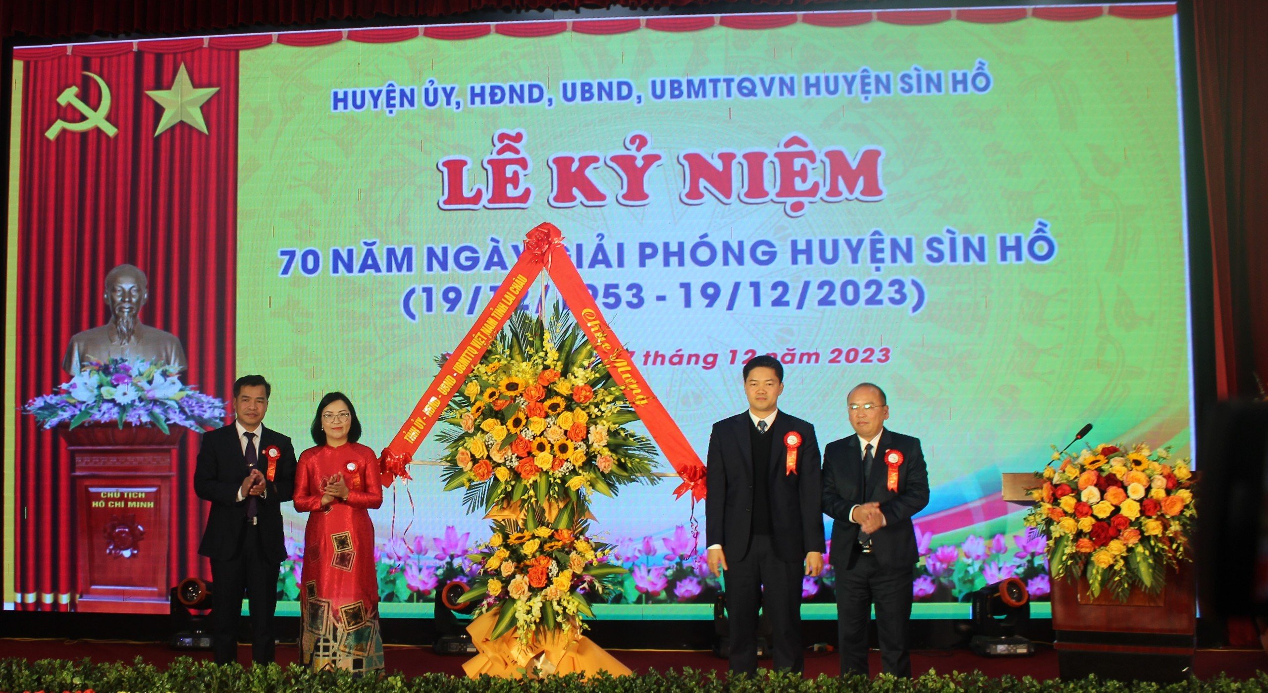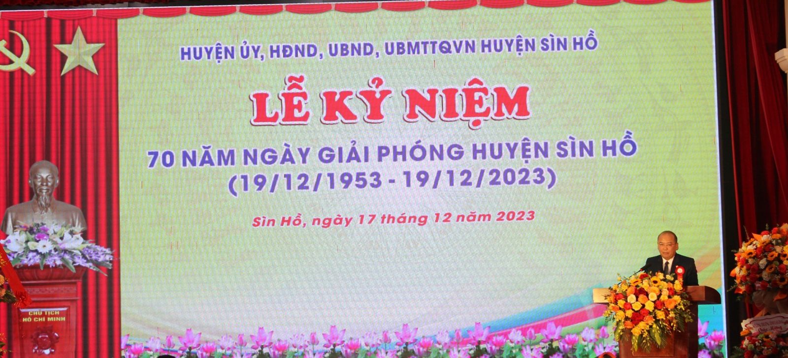 Sáng 17/12, Huyện ủy, HĐND, UBND, Ủy ban Mặt trận Tổ quốc huyện Sìn Hồ long trọng tổ chức Lễ kỷ niệm 70 năm Ngày ngày phóng huyện Sìn Hồ (19/12/1953-19/12/2023). Lễ kỷ niệm vinh dự được đón tiếp các đồng chí: Vũ Mạnh Hà - Ủy viên dự khuyết Ban Chấp hành Trung ương Đảng, Phó Bí thư Thường trực Tỉnh ủy; Giàng A Tính - Ủy viên Ban Thường vụ Tỉnh ủy, Phó Chủ tịch UBND tỉnh; các đồng chí Ủy viên Ban Thường vụ Tỉnh ủy; các đồng chí nguyên lãnh đạo huyện Sìn Hồ qua các thời kỳ; đại diện lãnh đạo các ban, sở, ngành, đoàn thể tỉnh; đại diện lãnh đạo các huyện, thành phố trong tỉnh; đại diện lãnh đạo các huyện Quỳnh Nhai (tỉnh Sơn La), huyện Tủa Chủa, Thị xã Mường Lay (tỉnh Điện Biên); Thường trực Huyện ủy, HĐND, UBND huyện; đại diện lãnh đạo các xã, thị trấn trên địa bàn huyện,…
